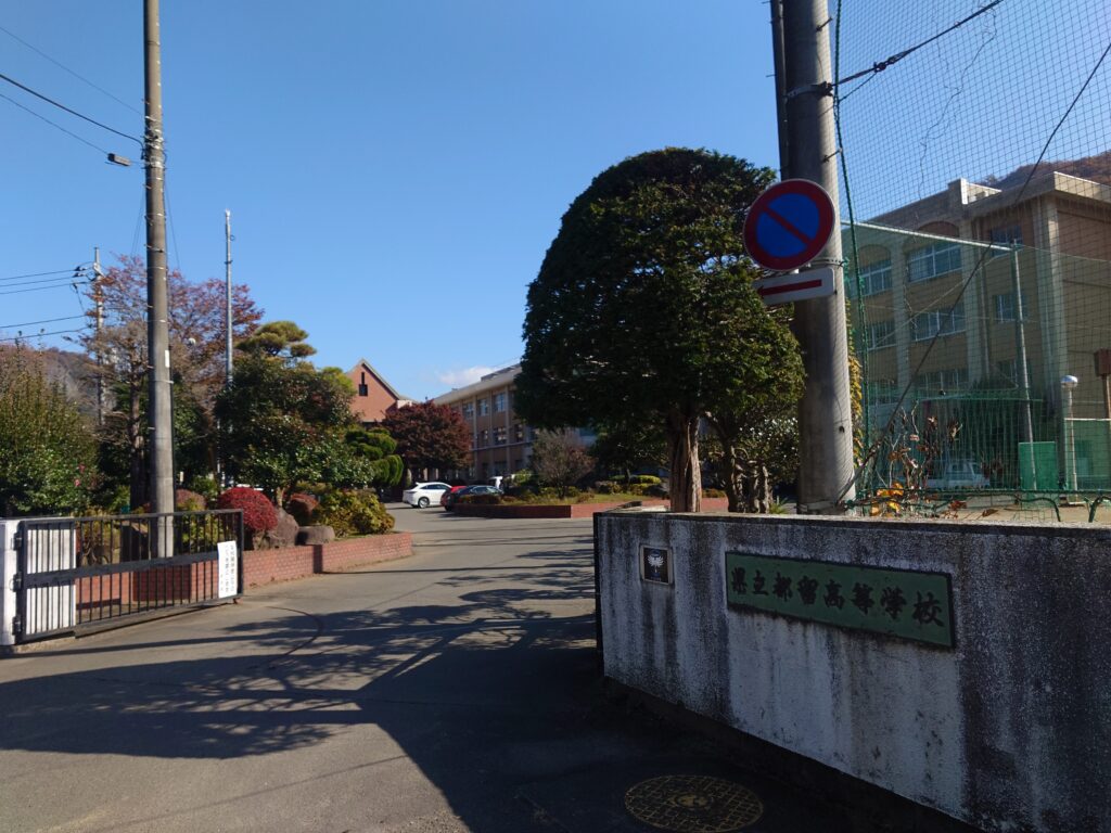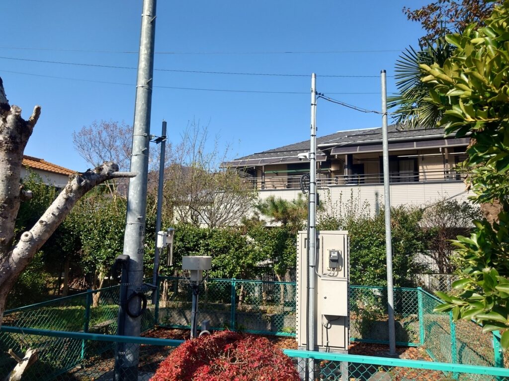 大月アメダスは都留高校の校門内にあるため訪れる際は気を付ける必要があります。観測機器は校門脇の植え込みの中に埋もれており見つけづらいですが、風車のない超音波式の風向風速計が目印となっています。この風向風速計は2021年に湿度計が新設されたときに風車式から更新されたもので、山梨県内では2023年現在大月と南部のみで見ることができます。頭上で測る風は別として、気温や降水量の観測環境としては植え込みの中にあるため問題があるのではないかと思います。